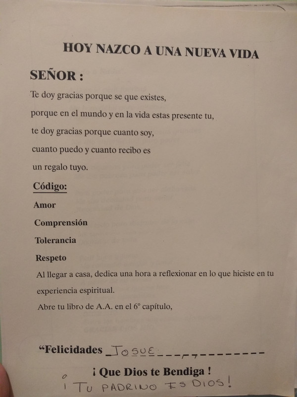Y así comenzó mi travesía en AA. Mi tío Ángel estaba dentro del grupo de cuarto y quinto paso llamado Renace. Cierto día mi mamá nos dijo que se iría por un fin de semana, que nos quedaríamos con mi papá y mi madrina. Que ella volvería y vaya que si volvió.