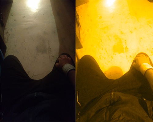 | Izquierda. Vista normal con las luces apagadas. Derecha. Simulación de la vista con luz. |